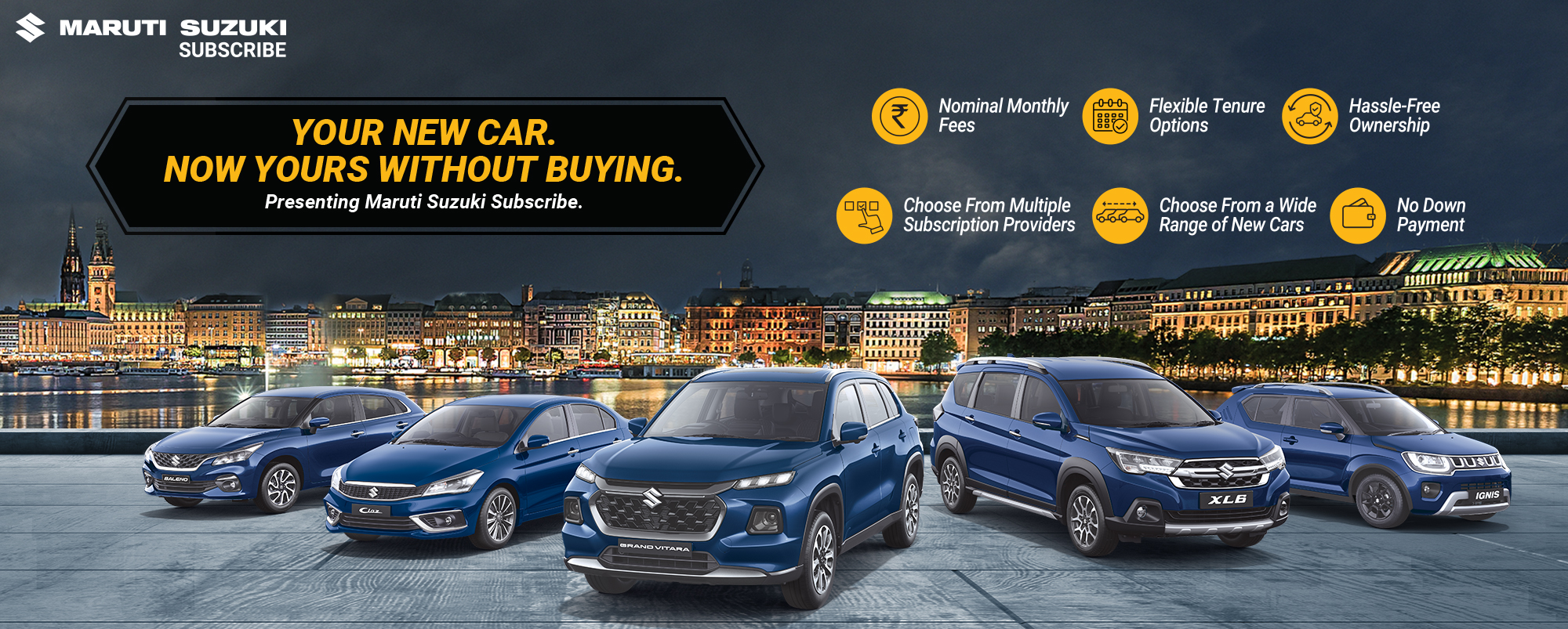 Maruti Suzuki Subscribe enables all customers to enjoy driving their preferred Maruti Suzuki cars without having to deal with all the financial responsibilities that come with owning a car.All you need to do is opt for a monthly subscription plan at a fixed monthly fee, which includes the routine maintenance and insurance costs, and choose a flexible tenure. At Barbate Automotive in, Fulchur, Gondia, all Hatchback, Sedan, SUV, the MUV models line-up includes Baleno, Invicto, EVitara, Jimny, Ciaz, Ignis, Fronx, Grand Vitara, XL6. Here, you will enjoy Maruti Suzuki Subscribe benefits such as: